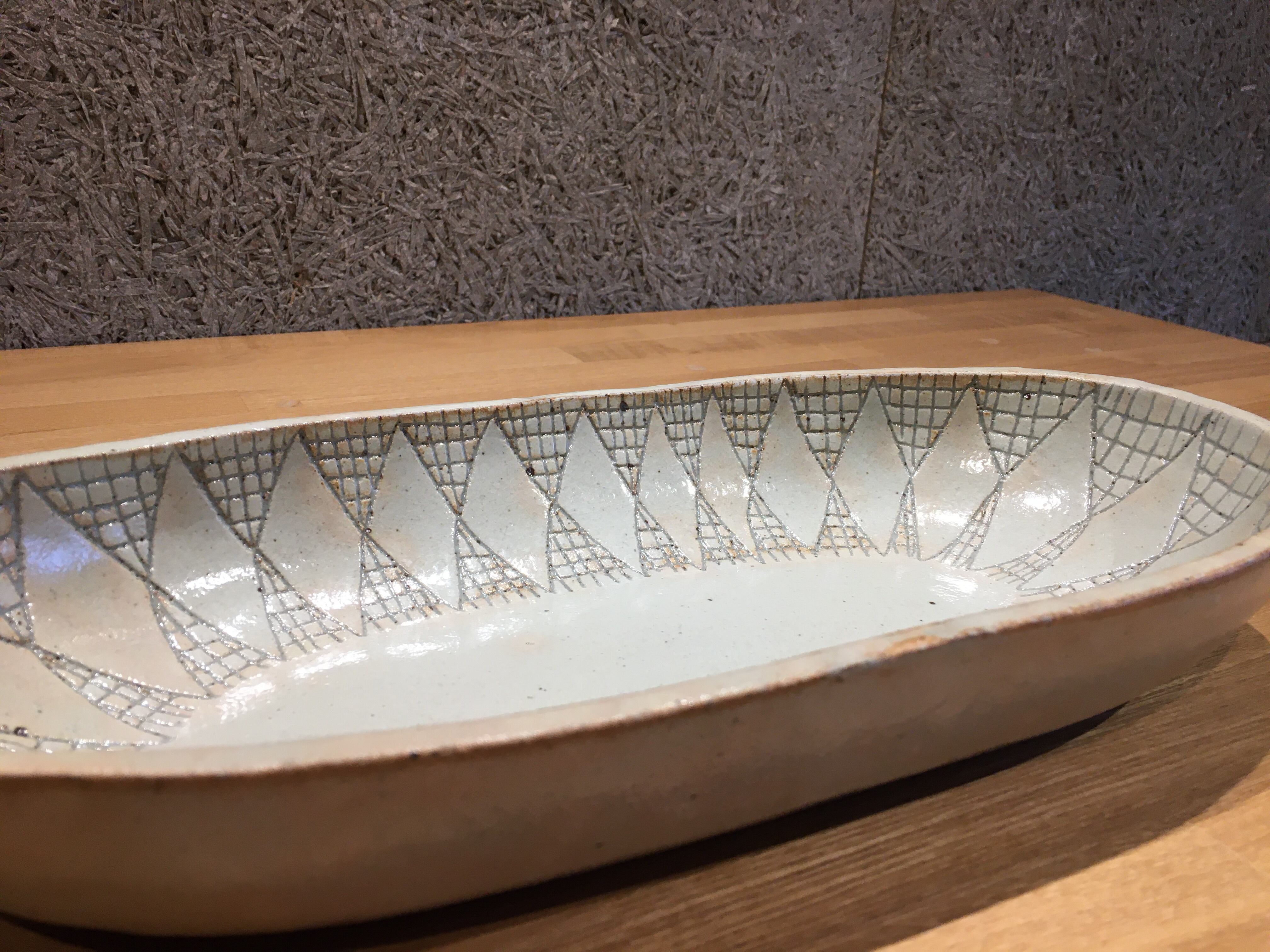 線刻が施された楕円鉢です。